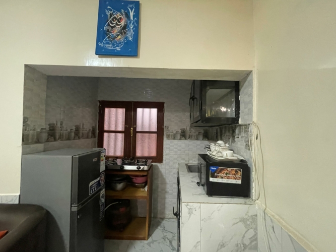 Ce logement comprend une spacieuse chambre climatisée, accompagnée d’un coin salon équipé d’une télévision. Il dispose également d’une salle de bain moderne ainsi que d’un espace cuisine fonctionnel, entièrement équipé (réfrigérateur, micro-ondes, gazinière et ustensiles de cuisine).